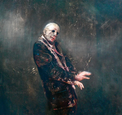 In a physical sense, his art seems truly surreal. We’re presented with this trans-formative process which appears akin to the deconstruction of humanity to base urges. In some pieces he wears a suit at the start, and as he begins to water down clay and cover his face in it he stains the whole environment, making anything he was feel like a parody of this new image an audience holds on to. He’ll often paint small markings, eyes, lips in the way of crude lines. Some aspects of his design are almost child-like ad that’s quite frightening to me. In another performance he transforms himself into a female figure and makes a regnant belly, carrying it around in an agonising movement. It’s weird because this is such a natural process and yet in this context it feels harrowing, especially when he tears through the belly with red paint and constructs a baby from the clay – tearing it out of his artificial womb. The look of twisted joy on his face could be one in appreciation of this process, but I like it more because it feels dark to me. Like a desperate clinging to love despite all else -but that’s juts what I thought. In fact many of his pieces rely of physical deliberation, and so they feel quite primal. In another piece, Sagazan begins to lodge branches into the mask of hardened clay that surrounds his head. It changes the shape of his skin and he appears deformed, or maybe just different. His art is formed from base ingredients like wood and clay and so feels like a primal, abhorrent beauty. His inexplicable mutterings also add to the overall sense of ritualism. There’s no doubt that his pieces are trans-formative, he undergoes a process of both deconstruction and reconstruction.