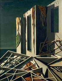 Chirico painted long roman arcades with sharp lines and colours dissolving in unusually poignant light, as if seeing a dream fade into a long dawn. Their art fleshed out the process of sharp features sinking into, or rising out of, blurred abstraction. Their paintings are often scattered with objects of symbolic resonance, and keep hold of a sense of profundity far distant from the viewer, often derived from a succession of Nietzsche’s philosophical principles outlined in artistic format. You can easily see it being a prominent source in Sage’s own use of architecture as a vehicle of exploration and expression, the metaphysical painters viewing architecture as a mode of definition, the literal tram lines over which the light of an artwork travels and is, in part, defined.