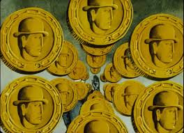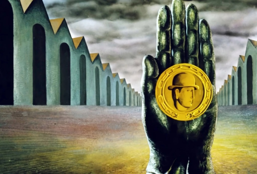 Intertextuality here is distinctly physical, the adornment of references to Bosch, El Greco and namely Magritte – whose famous painting ‘Son of Man’ is undoubtedly a central influence for the design of the antagonist – the yellow devil, the man in the bowler hat with gold in his hands. It’s influences are so physical with it’s hand drawn textures and childish animation, that it’s easy to get drawn in to thinking this film is merely the sum of its parts.