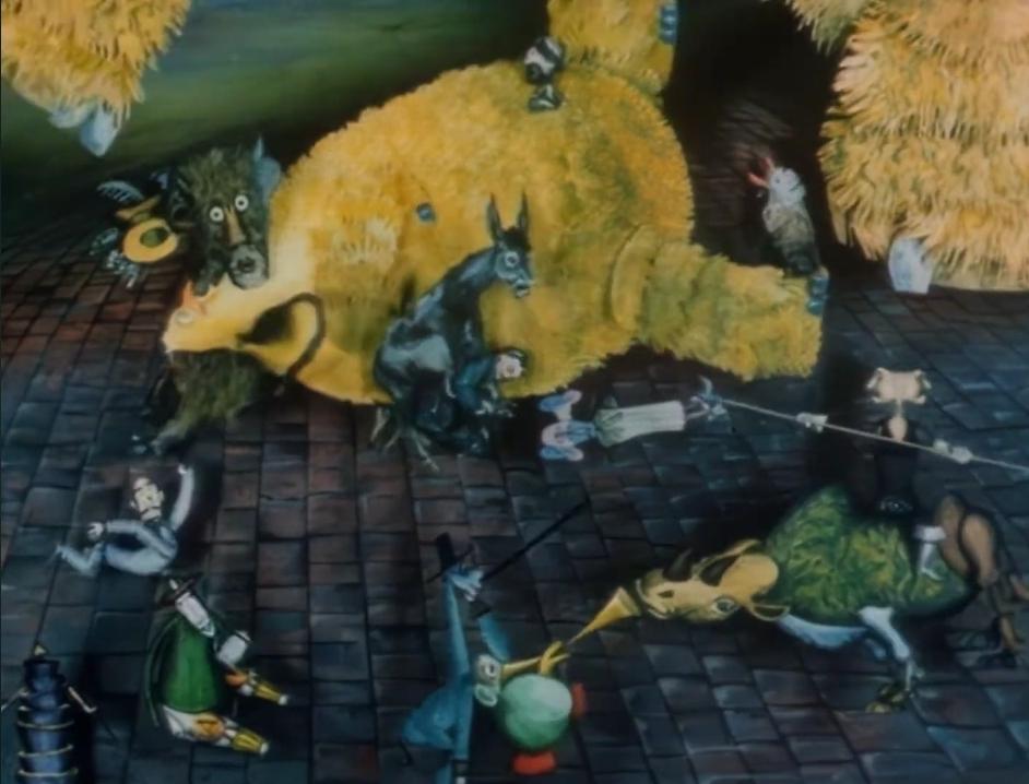 Glass Harmonica is evident in it’s criticism of Capitalism. The entire sequences laid out in darkly, monty-python esque animations of people chasing money and possessions, the man staring through the keyhole at treasure, using his wife to prop up the assortment of bizarre, ancient world riches he’s collected to add value to his dismal home. Indeed, Glass Harmonica contains an entire sequence where it’s townspeople transform into hideous creatures and tear each other apart, in some form through dance, in some form of barbaric cartoon savagery.